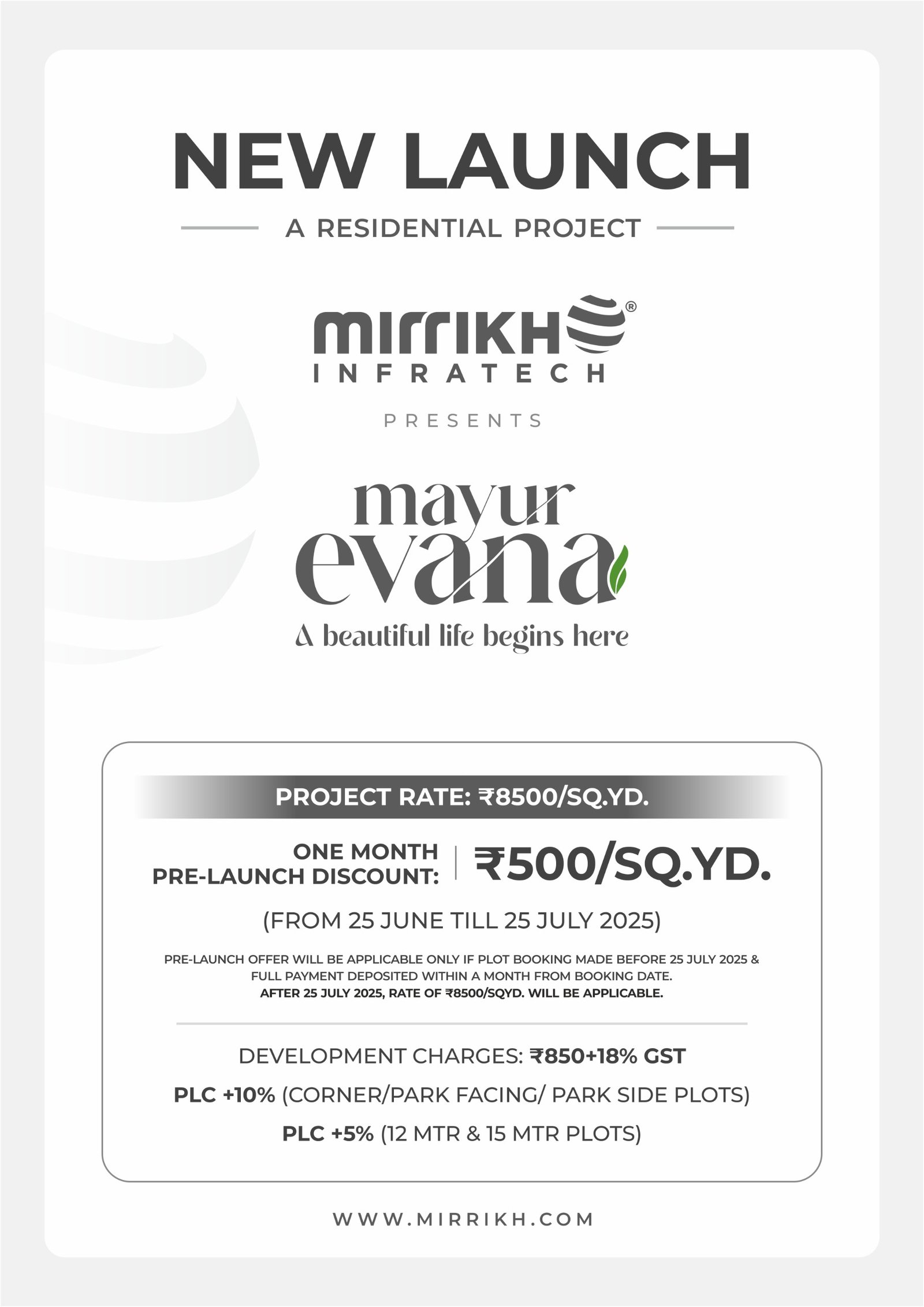 Mayur Evana is Mirrikh’s latest visionary residential development, strategically located in Kasindra, within the vibrant ecosystem of Dholera Smart City – India’s first planned smart city.